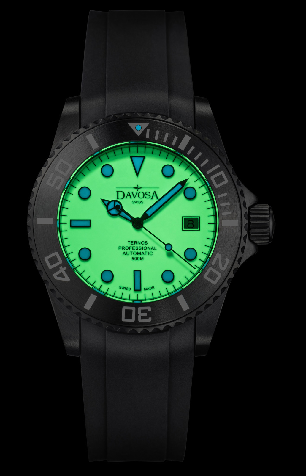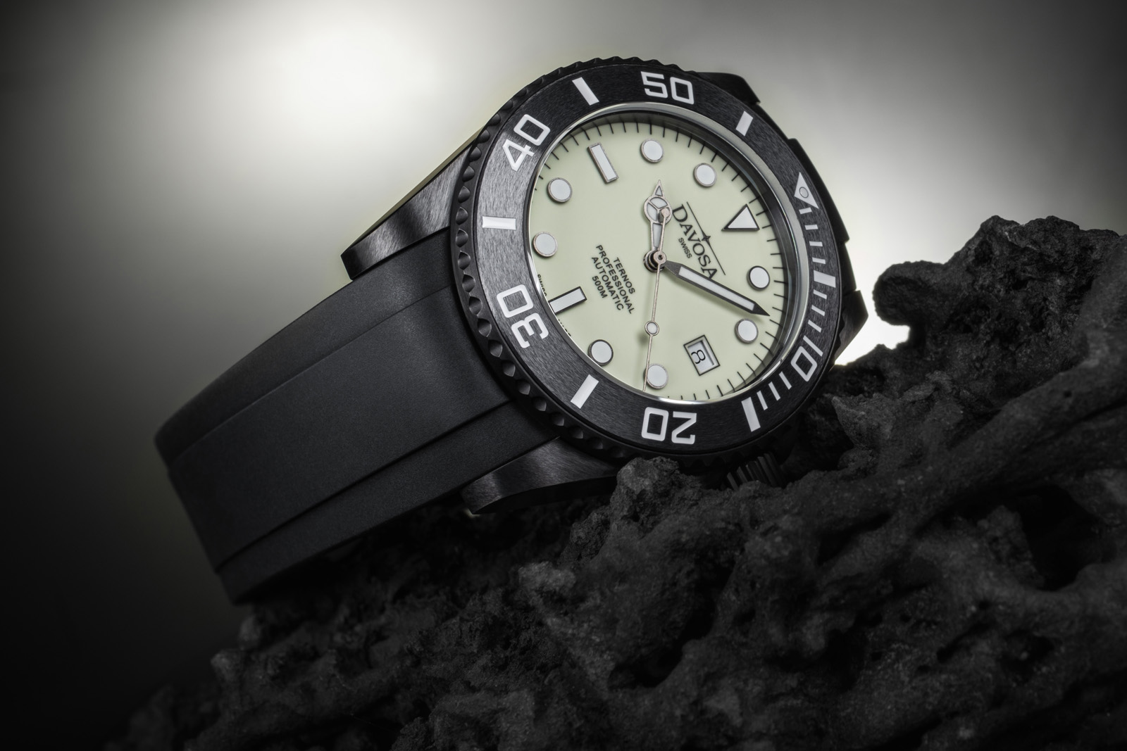 El doble de luminosidad: DAVOSA utiliza la pintura luminosa Super-LumiNova® C3 en toda la superficie de la esfera. Durante el día, el cálido tono beige recuerda a la arena de grano fino de los queridos destinos de buceo. En la oscuridad, la luz verde ultrafosforescente, que se distingue claramente de los números, las agujas y el punto luminoso del bisel, se despliega tras la correspondiente carga. Estos elementos emiten una fría luz azul debido al relleno con Super-LumiNova® BGW9.